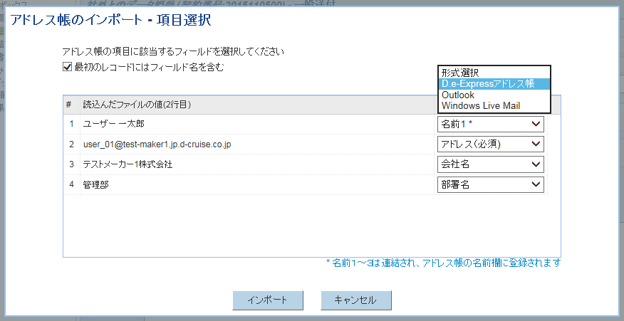 ※読込んだCSVファイルの形式が選択肢にない場合は、手動にてアドレス帳の項目に該当するカラムを指定してください