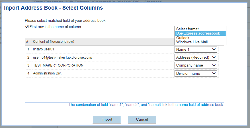 2.Select your CSV file format then the system automatically starts column mapping between your CSV file and the addressbook.