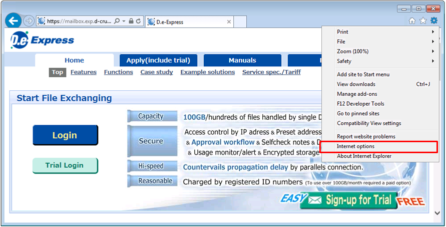 1. Click "Gear mark" at top-right or "tools" menu, then click "Internet options" menu.