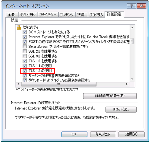 3. セキュリティ項目の、「TLS1.2の利用」がチェックされていることを確認します。