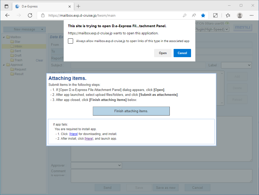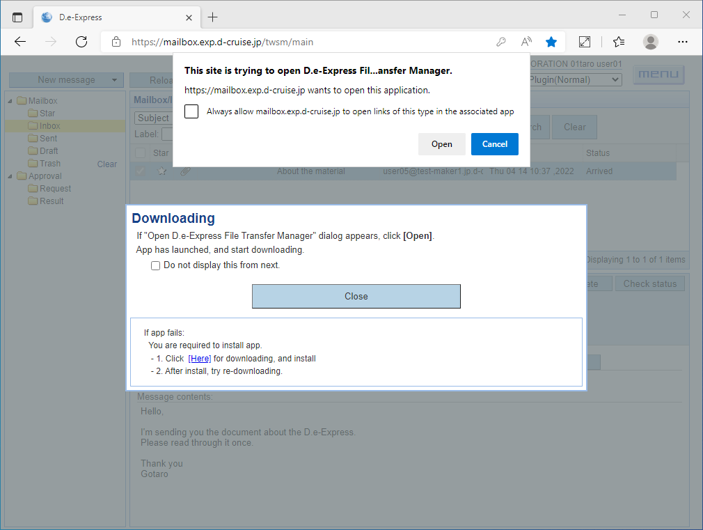 [5] Click "Open" button in the dialog and the "D.e-Express File Transfer Manager"(plug-in) will launch.