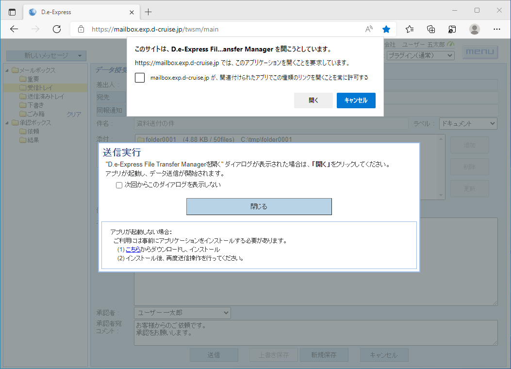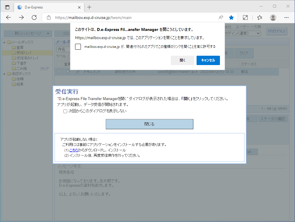 画面上部に、「D.e-Express File … Managerを開こうとしています」 ダイアログが表示されます。
